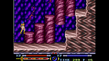 スライディングで渡った先に大MPがあります。 バリアを張ってから取ると無駄なくMPを回復できます。 写真の位置からもう少し左に進んだ場所でないと取れません。 右端まで進むと 1UP があります、そこから真下へ降りないとダメージを受けます。 |