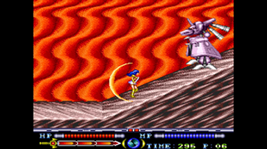 中ボスが待ち構えています。 下方向に 3WAY を撃ちつつ移動し、優子の上に来ると落下してきます。 また、時々地面に 4 つの炎を撒きます。 この炎は暫く残るうえ、接触しているあいだ連続ダメージを受ける危険な攻撃です。 3WAY は破壊可能なので、大きく距離を取って戦いましょう。 炎はぶつからないように中ボスが反対側へ行ってる隙に飛び越えましょう。 |