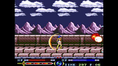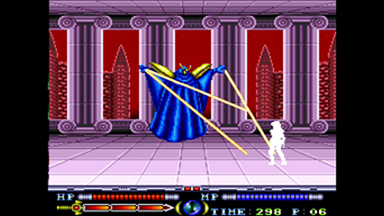 【鉄球】 正面方向に鎖鉄球を打ち出し、引き戻します。 攻撃範囲が非常に広く下がってかわすことは困難です。 (画像の位置からの攻撃の場合は画面端にいても当たります) 懐に飛び込めば当たりませんが、鉄球を引き戻す際に内側に判定が移動します。 スライディングで背後に回り込むつもりで密着した方がいいでしょう。 もし懐に飛び込めなかった場合は可能な限り距離を取り、タイミングを合わせて垂直大ジャンプをすればかわせるかもしれません。 |