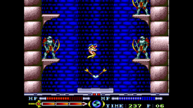 エレベータが最初の難所です。 上昇中は飛び出す大トゲと弓兵の激しい攻撃に晒されます。 弓兵は優子の位置に合わせて上下斜め45度と真横の三方向に矢を撃ってきます。 攻撃は全てエレベータ中央でタイミングよくジャンプをすればかわせるので、ついでに可能な限り敵を倒して攻撃を少しでも緩めていきましょう。 |