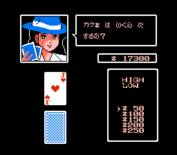 相手が出したカードに対して自分のカードの数字が大きいか小さいかを当てるミニゲームです。 必ず5回勝負をさせられます。 同じ数字にはならないのである程度予想がし易いです。賭け金も決められるので判断が難しい場合は出費を抑えるといいでしょう。  |