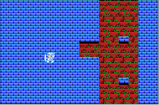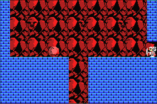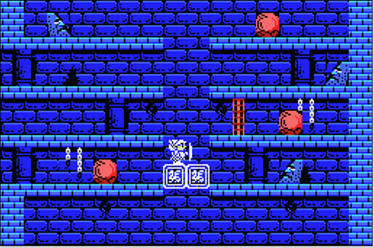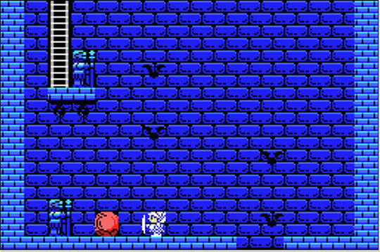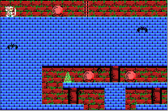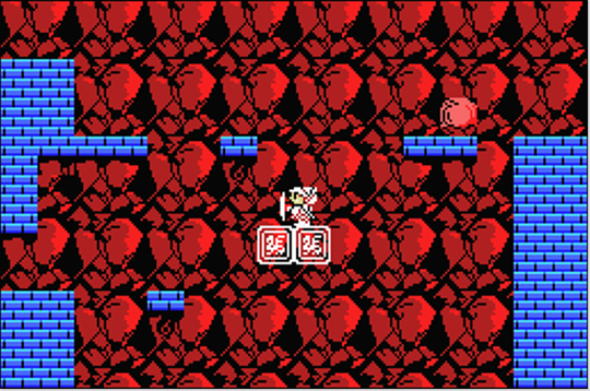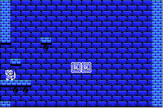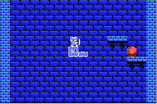 画面上のコウモリを全滅させてから動く足場に乗った状態で「右」「下」「左」「上」を入力したあとに岩を破壊する