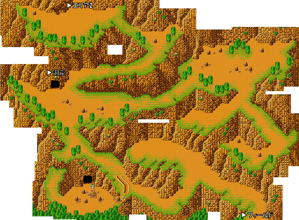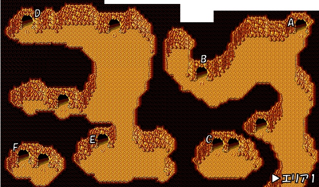 | 洞窟 | 南西の出口 | 決まった順番に通路を抜けて反対側の出口に向かう。正解のルートは通路手前の地面にある記号で判別する。正解ルートはマップのアルファベット順 |