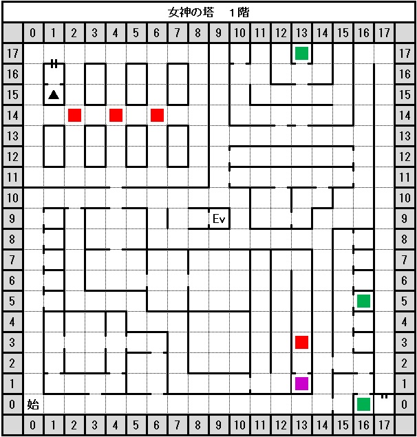 | 1 階 | X13:Y01 | 戦闘:レッドドラゴン (ダメージ固定なので回復タイミングさえ誤らなければ楽勝) |