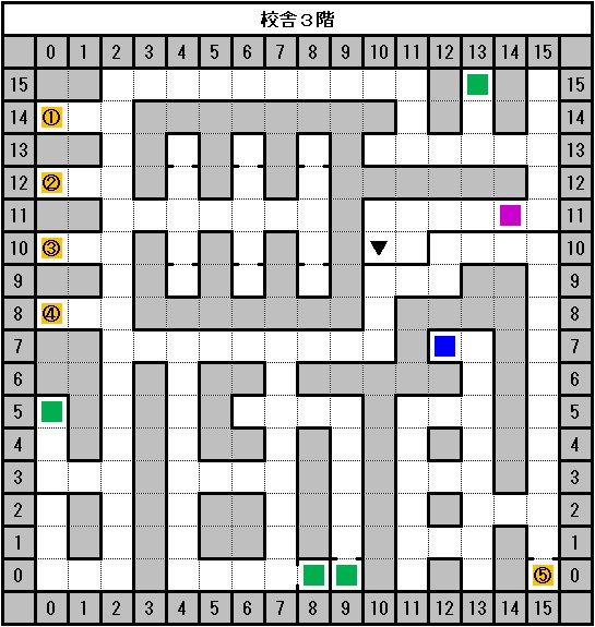 | 校舎 3F | X15Y02 | 通路 | 見えない壁が南への道を塞いでいる 魔方陣(1)が起動し、時計塔へ進めるようになる  |